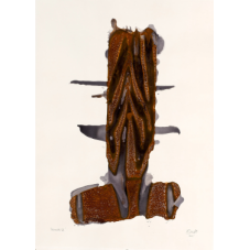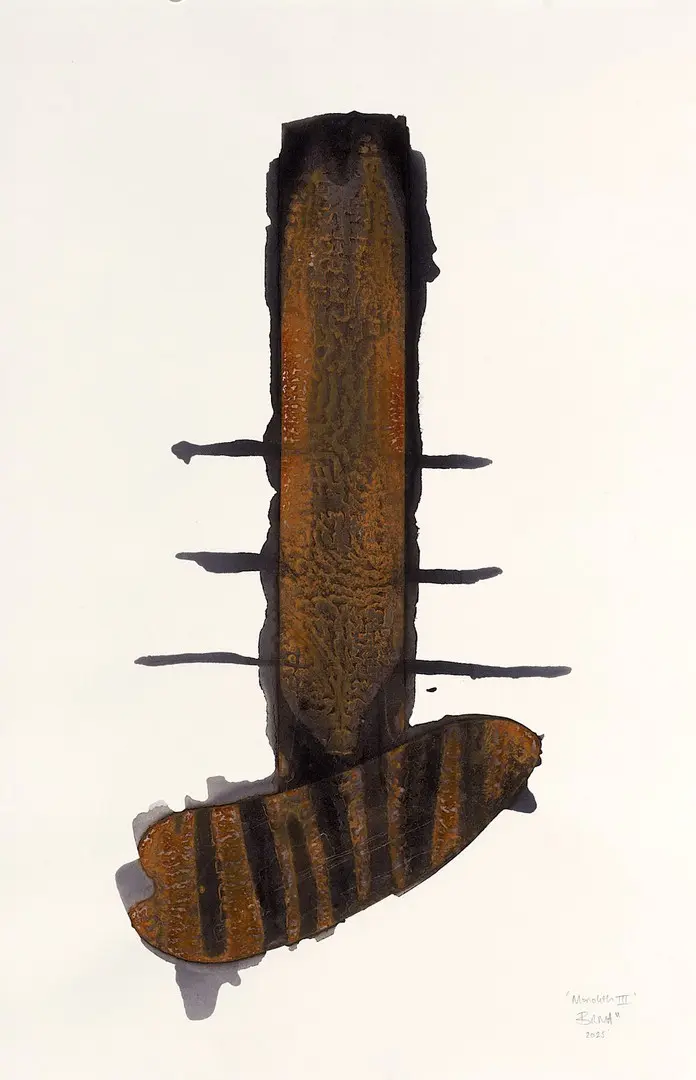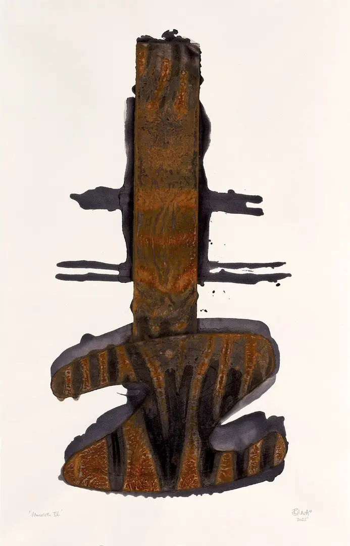 “I suppose I am predominantly a builder. I adore the pure and innocent sheer joy of creating something from a collection of base elements, a suggestion of a treeline from a hand made solution of ink, soot, metal powders and boiled down tannin from oak shavings. The suggestion of a stone wall by relief printing hessian with a hand full of sawdust or sand or powdered pigments. I also love to let nature play its part in my work, often leaving plates or paintings in the wind and rain for a time, overnight or even for several days. I employ gravity, time and the elements to create my work.